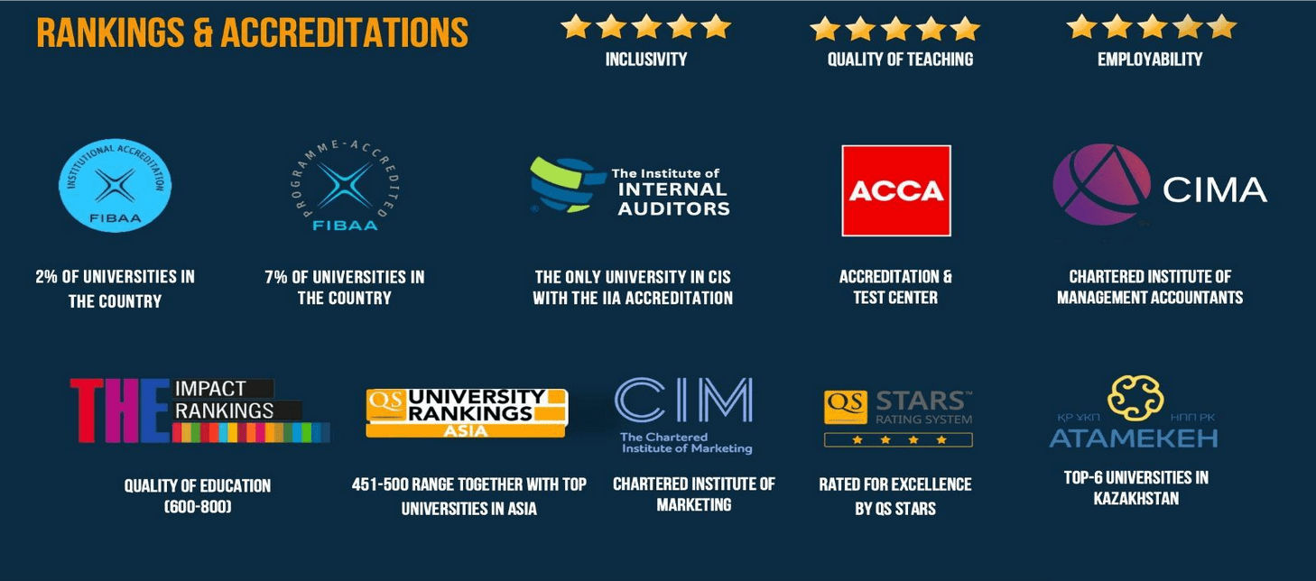 Narxoz has earned international accreditations from FIBAA, ACCA, CIMA, CIM